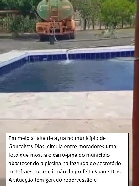 Moradores de Gonçalves Dias fizeram um grave relato nas últimas horas: um carro-pipa pertencente à Prefeitura estaria sendo utilizado para encher a piscina do secretário de infraestrutura, é irmão da prefeita.