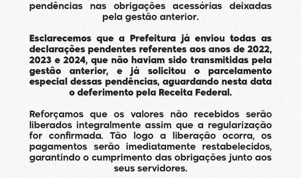 Com essas pendências de 2025, somadas às obrigações não transmitidas nos anos anteriores, o município se encontra:
